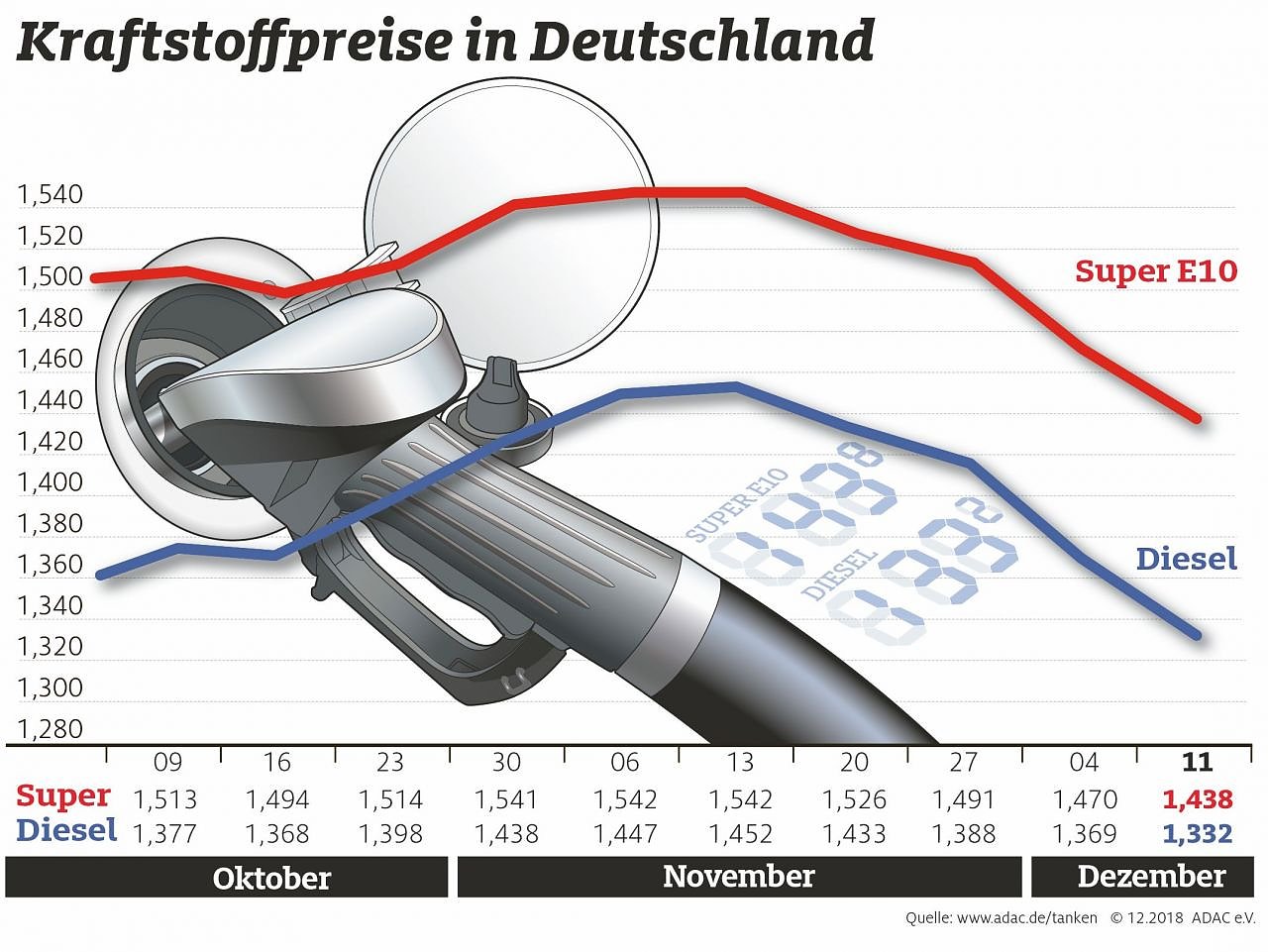 Ein Barrel der Sorte Brent hat sich am Weltmarkt seit Anfang Oktober um mehr als 25 Prozent verbilligt. Zudem kommen die mittlerweile wieder gestiegenen Pegelstände an Rhein, Main und Mosel der Versorgung Süddeutschlands zugute. Der ADAC sieht weiterhin Spielraum für einen Rückgang der Verbraucherpreise an den Tankstellen.