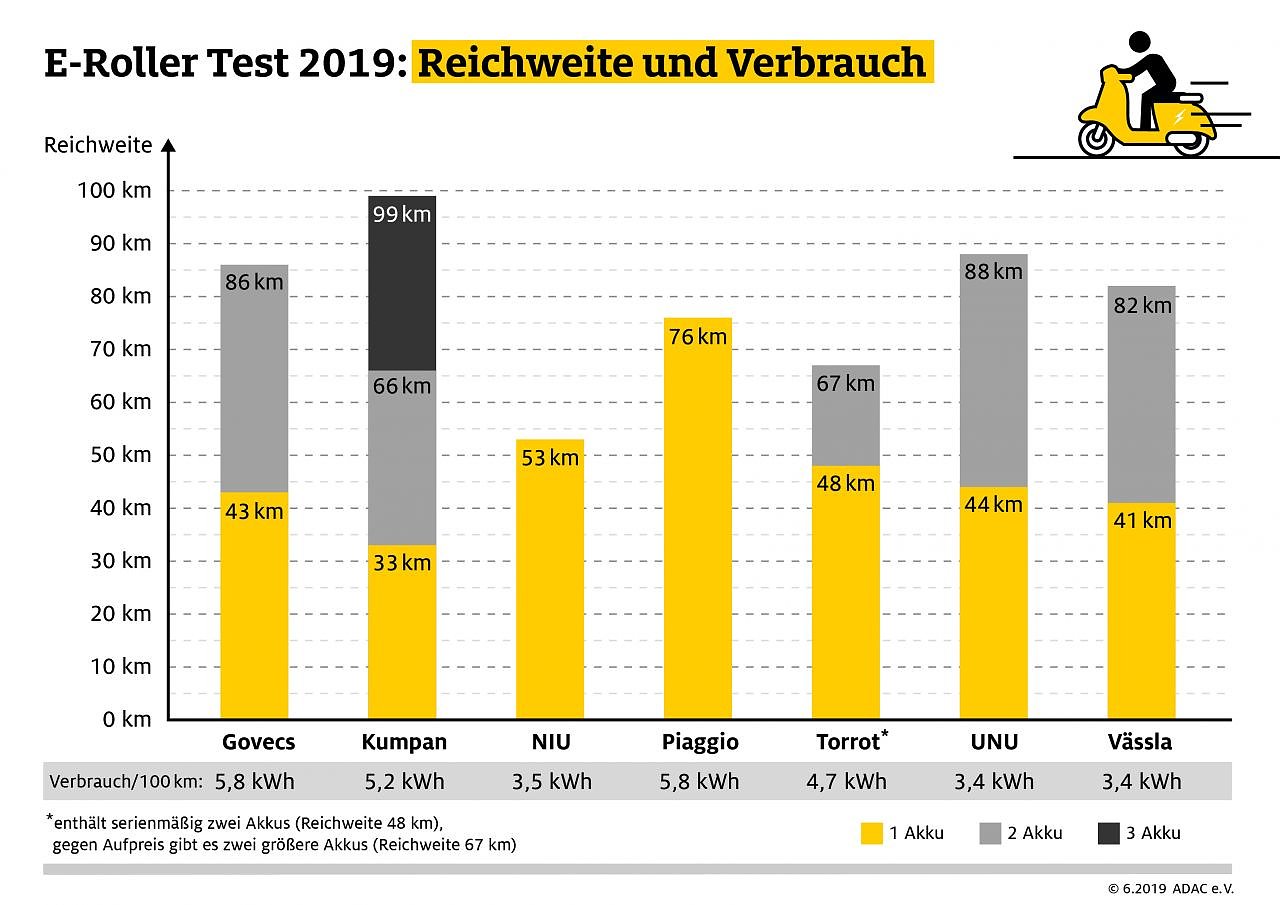 Damit Roller-Interessenten beim Kauf keine bösen Überraschungen erleben, hat der ADAC die wichtigsten Tipps zusammengestellt: Die besten Roller punkten mit großer Reichweite, geringem Stromverbrauch und kurzer Ladedauer. Die Reichweite von Elektroroller-Akkus reicht in der Regel für Stadtfahrten. Für längere Überlandtouren hingegen sind sie nicht geeignet. Ideal ist ein herausnehmbarer Akku, den fünf der sieben getesteten Modelle anbieten, weil sich dieser in den eigenen vier Wänden aufladen lässt und im Winter vor niedrigen Temperaturen geschützt werden kann. Auch ein modulares Akkusystem ist von Vorteil. Der Kumpan lässt sich auf maximal drei herausnehmbare Akkus aufrüsten, die Konkurrenten Torrot, Vässla und unu immerhin auf bis zu zwei.