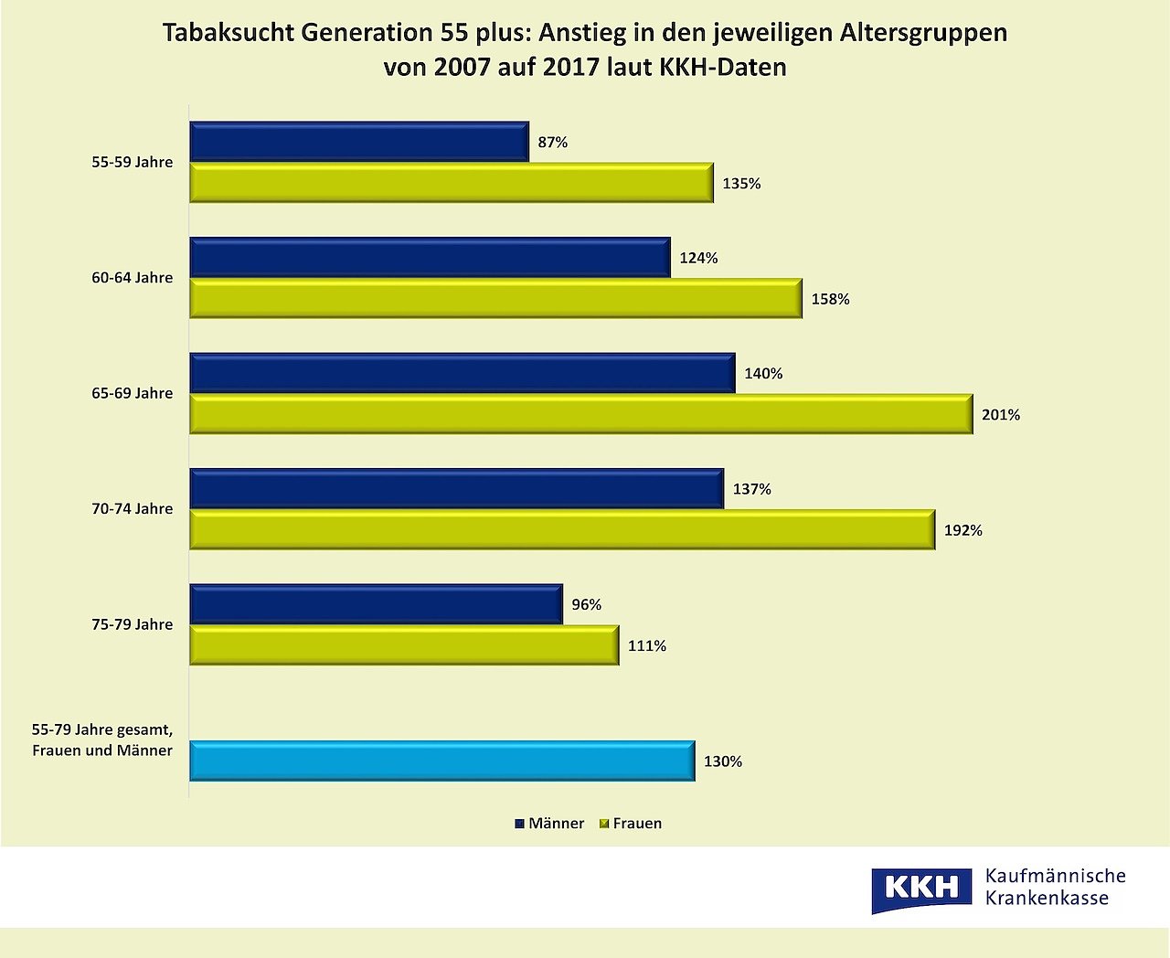 Zwar sinkt auch bei den Älteren die Zahl der Alltagsraucher im Allgemeinen, die Zahl der Exzessiv-Raucher aber hat laut Daten der KKH Kaufmännische Krankenkasse drastisch zugenommen. So wurden im Jahr 2017 rund 50.000 Versicherte im Alter von 55 bis 79 Jahren wegen Tabakabhängigkeit, Entzugserscheinungen, eines akuten Tabakrausches oder psychischer Probleme aufgrund von Tabak ärztlich behandelt.