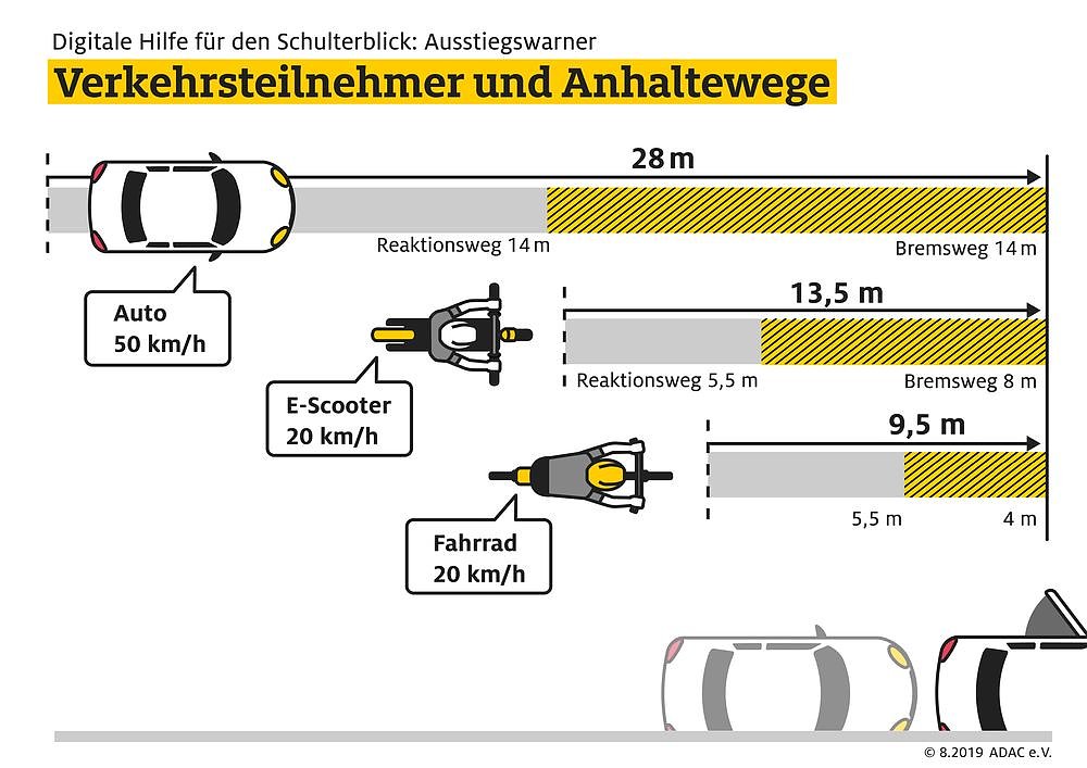 Auch wenn in der Parksituation mit verdecktem Sensor die Systeme nur eingeschränkt funktionieren, sind Ausstiegswarner aus Sicht des ADAC sinnvoll um Dooring-Unfälle zu vermeiden. In vielen Fahrzeugen ist die nötige Sensorik bereits mit einem Totwinkelassistenten verbaut und könnte vom Hersteller effizient genutzt werden. So können die Ausstiegswarner mit wenig Aufwand einen wichtigen Beitrag zur Verkehrssicherheit leisten - auch im Hinblick auf E-Scooter, die meist einen längeren Bremsweg haben als Fahrräder.