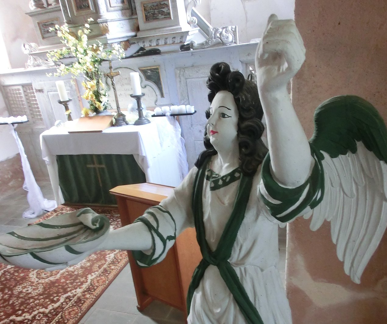 Lange schon war der Taufengel nicht mehr flügge und lag auf dem Pfarrhausboden. Vor einigen Jahren wurde er - frisch, aber nicht denkmalgerecht angemalt - wieder in der Kirche aufgestellt. Anfang diesen Jahres veränderte er sein Aussehen völlig: Restauratorin Antje Pohl hat ihn gründlich untersucht und ihn farblich wieder in seinen barocken Ursprungszustand versetzt.