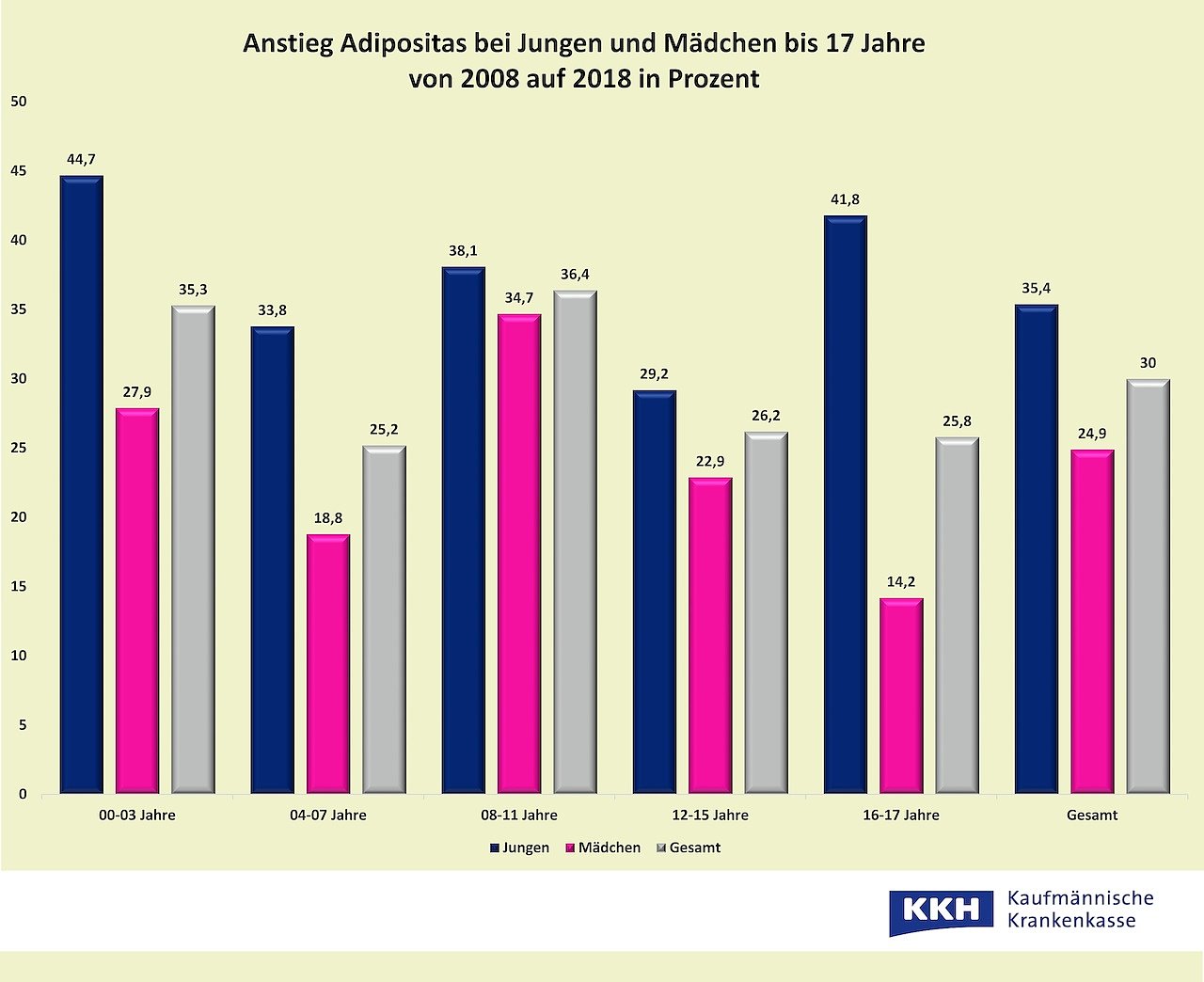 Immer mehr junge Menschen bringen zu viele Kilos auf die Waage. So nahm die Zahl der Kinder bis 17 Jahre, die unter extremem Übergewicht (Adipositas) leiden, zwischen 2008 und 2018 um 30 Prozent zu. Das zeigt eine aktuelle Datenerhebung der KKH Kaufmännische Krankenkasse. Mit 36 Prozent ist das Plus bei den Acht- bis Elfjährigen am höchsten. Auffallend: In allen Altersklassen ist die Steigerungsrate bei Jungen höher. Bei den 16- und 17-Jährigen beispielsweise liegt sie bei den Jungen bei 42 Prozent gegenüber 14 Prozent bei den Mädchen.