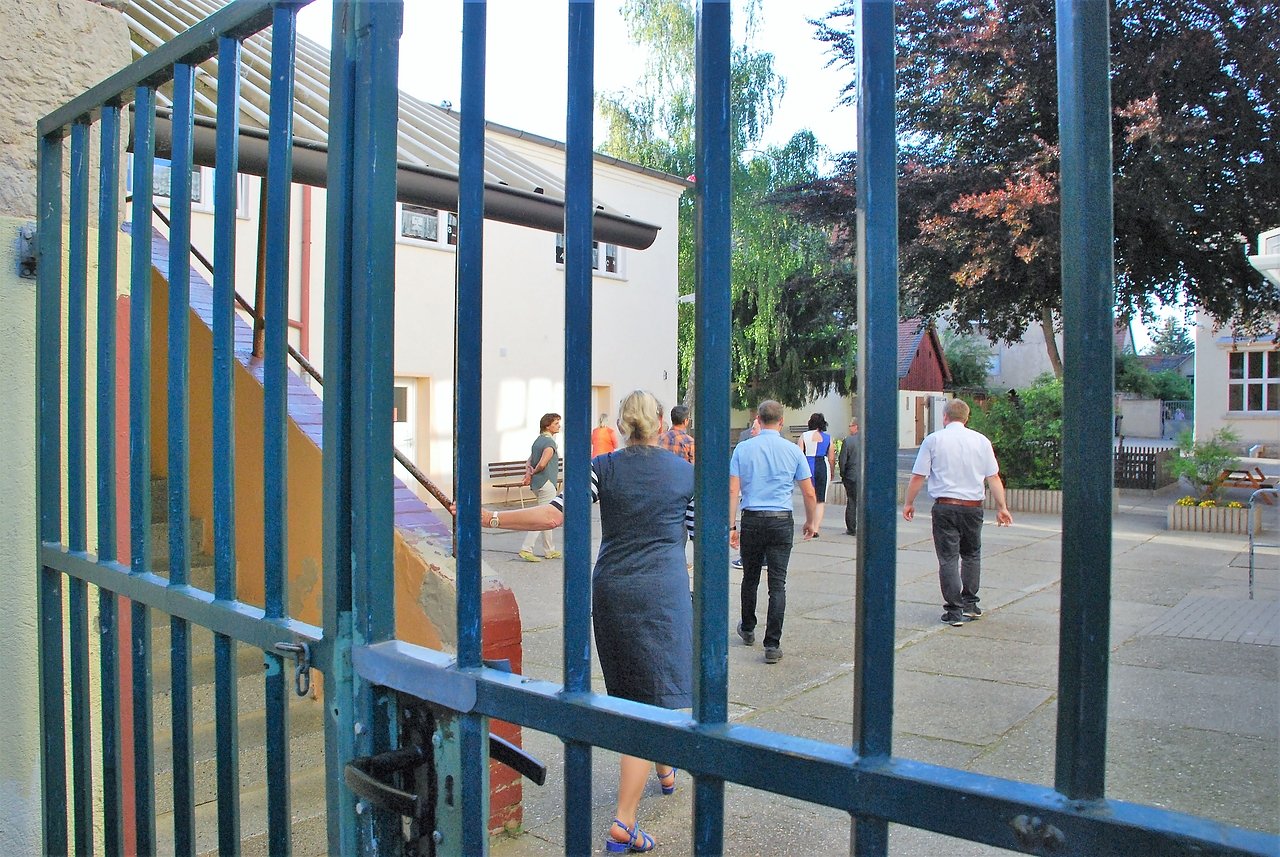Ausgesperrt. Elterninitiative und Medienvertreter durften die Grundschule nicht betreten. Dies sei eine CDU-Veranstaltung, erklärte CDU-Stadtrat Manfred Ahlfänger einem an der Besichtigung der Schule Interessierten. (Foto: J. Miche)