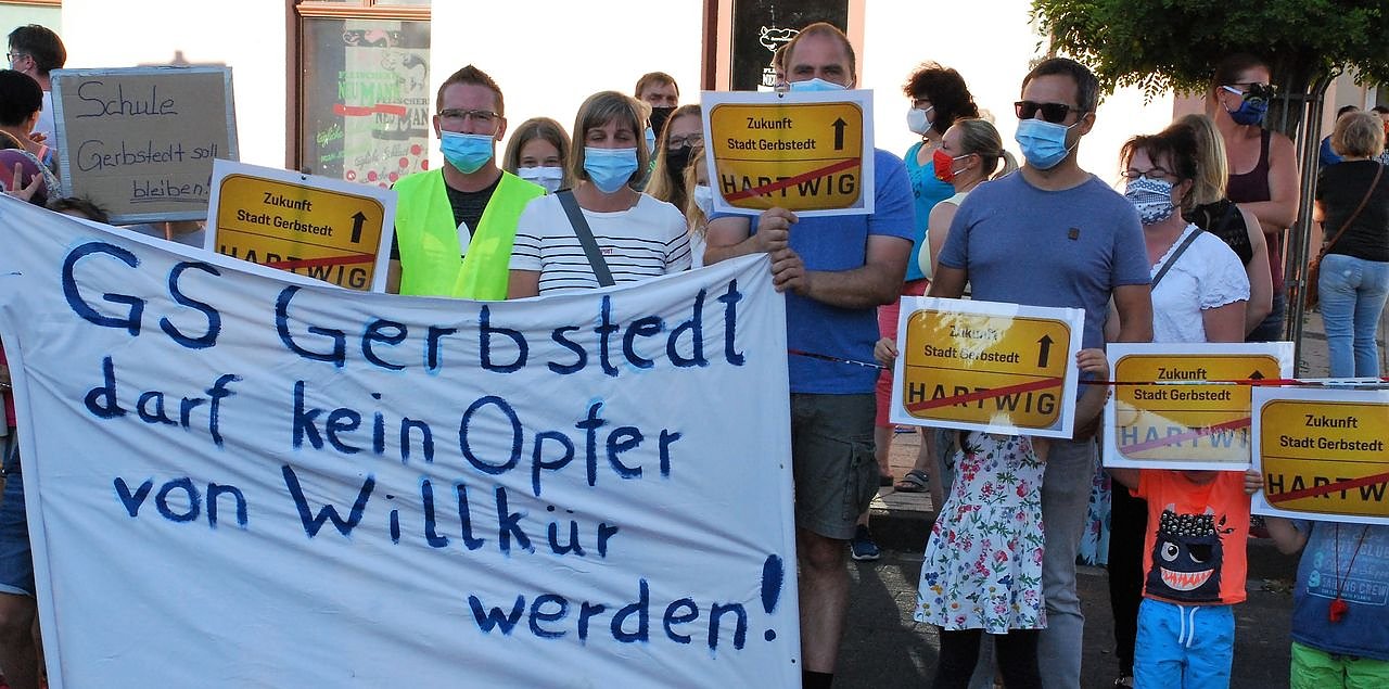Es stellte sich die Frage, welche Absicht die Initiatoren verfolgten. Sollte der Eindruck erweckt werden, die Dörfler wollten die Schließung der Gerbstedter Schule, damit ihre eigenen Kinder nicht in die Stadt müssen? Unterstrichen wurde dies durch Plakate mit Negativ-Aufschriften in gestalterischer Anlehnung an Ortseingangsschilder: Zukunft Stadt Gerbstedt mit Pfeil nach oben und in der unteren Hälfte, quasi als Hinweis auf das territoriale Gebilde, das man hinter sich gelassen bzw. aus seinem Leben getilgt hat, den mit einem roten Balken fett durchgestrichenen Namen Hartwig.