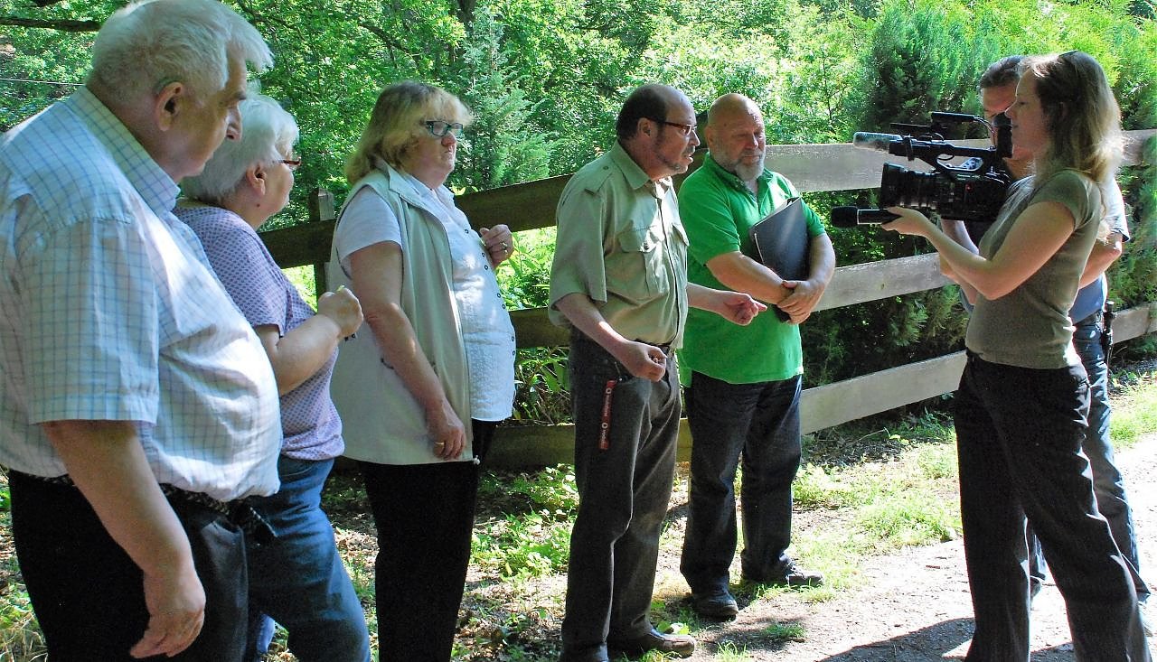 Pro Baum hatte eingeladen, Peter Frobel gab dem TV-Sender PunktUm ein Interview. Im Vordergrund links die Eigentümerfamilie Ludwig und Gudrun Peter. (Foto: J.Miche)