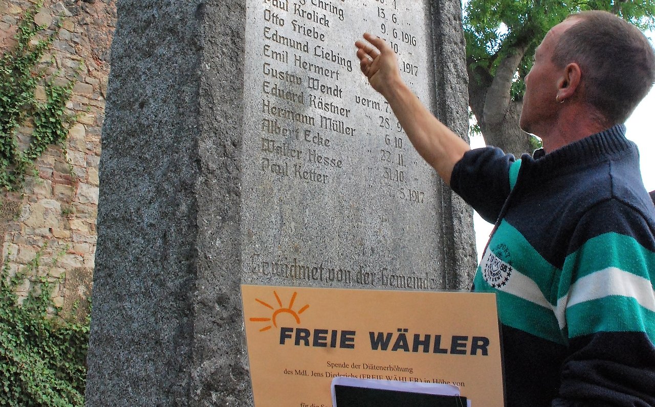 ...der Kreisvorsitzende Mansfeld-Südharz der Freien Wähler und Landtagsabgeordnete Jens Diederichs (Freie Wähler) für die Sanierung des Kriegerdenkmals in Thondorf gespendet hat. Bis Ende 2020 will der Abgeordnete weiterhin monatlich einem Verein bzw. einer Initiative seiner Heimat auf diese konkrete Weise helfen.