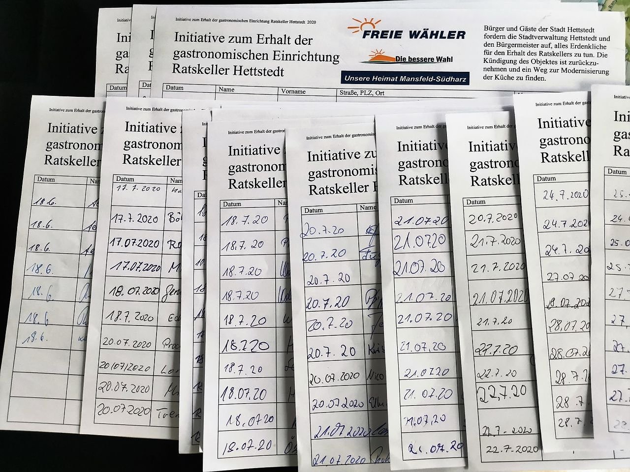 Jens Diederichs (MdL), Kreisvorsitzender der Partei Freie Wähler, sieht sich in den Aktionen zur Rettung des Ratskellers bestätigt. Er sagt: Unsere Wortmeldungen, der Bürgerdialog und die Unterschriftenaktion haben ganz offensichtlich Druck erzeugt. Es hat sich einiges bewegt. Mehr als 300 Menschen haben sich solidarisiert mit den Ratskellerbetreibern und mit ihrer Unterschrift gleichzeitig die Stadtverwaltung und den Bürgermeister aufgefordert,, alles Erdenkliche für den Erhalt des Ratskellers zu tun‘, wie es auf den Listen stand. Wichtig war die – endlich auch öffentliche – Sondersitzung des Stadtrates mit dem Beschluss. Wir sind zuversichtlich, dass es weitere Anstrengungen zur Rettung dieser traditionsreichsten gastronomischen Einrichtung Hettstedts gibt. Diederichs dankt allen Menschen, die sich mit ihrer Unterschrift für den Erhalt des Ratskellers Hettstedt stark gemacht haben.
