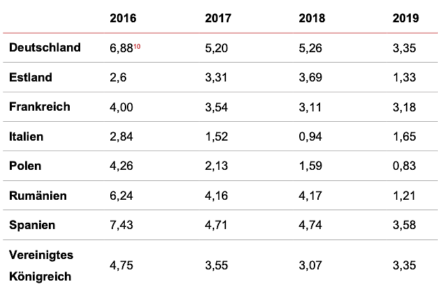 Der Durchschnittspreis für ein Gigabyte mobiles Datenvolumen ist in Deutschland im Vergleich zu den anderen Ländern der höchste – in den Jahren 2017 und 2018 – bzw. der zweithöchste – in den Jahren 2016 und 2019.
