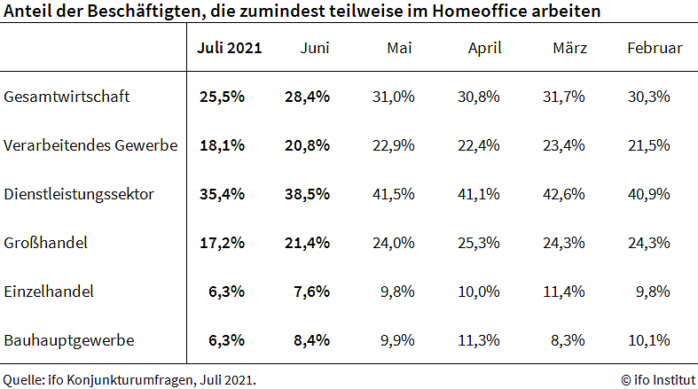 Auch bei den Dienstleistern fiel die Quote. Bei Fernseh- und Radiosendern kehrten besonders viele Beschäftigte ins Büro zurück. Nach 60,9 Prozent im Juni waren im Juli nur noch 36,9 Prozent zumindest teilweise im Homeoffice. Auch im Verlagswesen fiel der Wert deutlich. Im Juli waren es nur 40,3 Prozent, nach 50,4 Prozent.