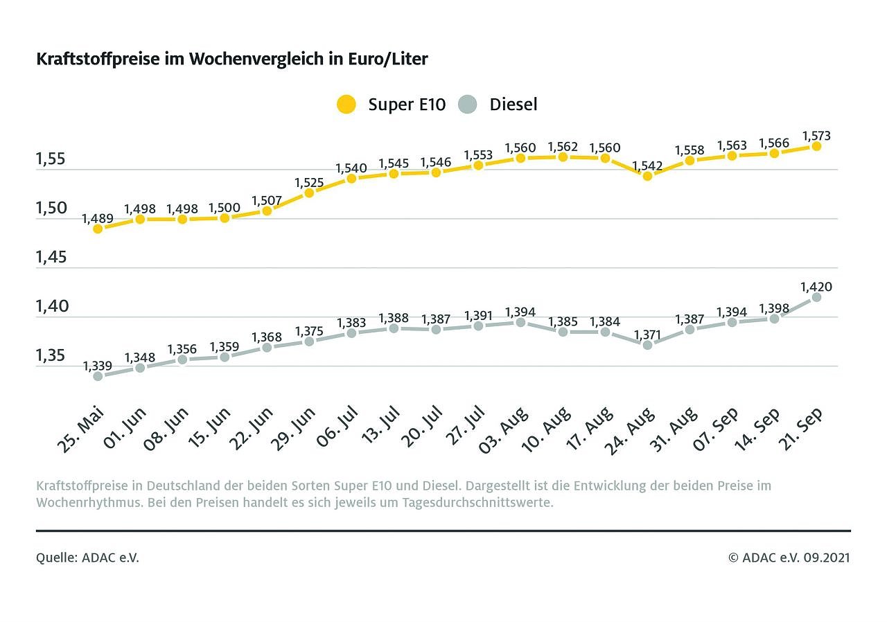 Die Spritpreise befinden sich weiter auf Höhenflug. Wie die aktuelle ADAC Auswertung der Kraftstoffpreise zeigt, stieg der bundesweite Durchschnittspreis für einen Liter Diesel im Schnitt um 2,2 Cent und lag zuletzt bei 1,420 Euro. Auch Super E10 verteuerte sich im Vergleich zur Vorwoche um 0,7 Cent auf 1,573 Euro je Liter...