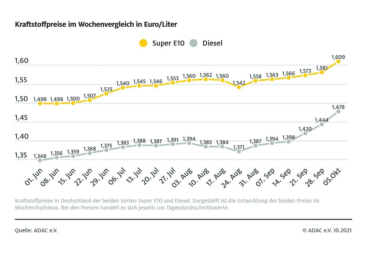Ein Liter kostet aktuell 1,478 Euro und liegt damit um 3,4 Cent über dem Vorwochenpreis. Dies zeigt die aktuelle ADAC Auswertung der Kraftstoffpreise in Deutschland. Die Ursache für den kräftigen Preisaufschlag liegt in den deutlich höheren Rohölnotierungen. So kostet ein Barrel Rohöl der Sorte Brent auf dem Weltmarkt derzeit rund 83 US-Dollar – fünf Dollar mehr als in der Vorwoche.
