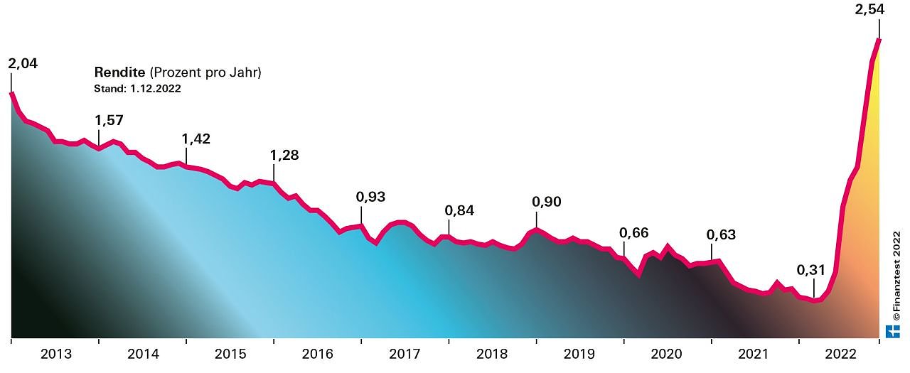 Die durchschnittliche Rendite der besten zehn Anbieter im Finanztest-Dauertest ist mit 2,54 Prozent für einjähriges Festgeld so hoch wie in den letzten neun Jahren nicht mehr (siehe Grafik).
