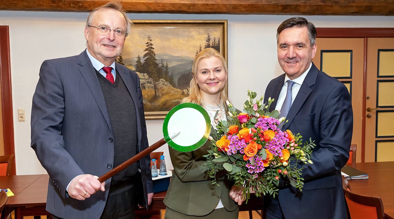 Gratulation zur Wahl als neue HSB-Geschäftsführerin: Thomas Balcerowski (rechts), HSB-Aufsichtsratsvorsitzender und Landrat des Landkreises Harz, sowie HSB-Geschäftsführer Matthias Wagener (links) gratulierten Katrin Müller am heutigen Vormittag im Wernigeröder Rathaus zu Ihrer Wahl als neue HSB-Geschäftsführerin ab dem 1. Juli. (Foto: HSB/Dirk Bahnsen)