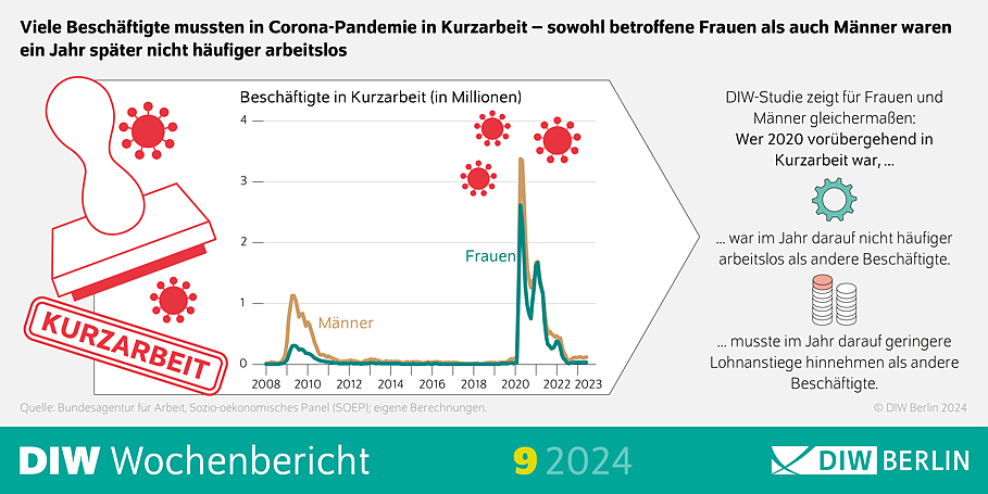 Eine aktuelle Studie des Deutschen Instituts für Wirtschaftsforschung (DIW Berlin) zeigt jetzt: Dennoch haben sich geschlechtsspezifische Ungleichheiten auf dem Arbeitsmarkt durch Kurzarbeit während der Corona-Pandemie nicht verstärkt. Sowohl Frauen als auch Männer waren ein Jahr später nicht häufiger arbeitslos oder in geringerem Umfang erwerbstätig als Beschäftigte, die nicht in Kurzarbeit mussten. Lediglich bei der Lohnentwicklung mussten sie Abstriche machen: Bei Frauen und Männern ohne Kurzarbeit zu Pandemiebeginn sind die Stundenlöhne im Jahr darauf etwas stärker gestiegen.