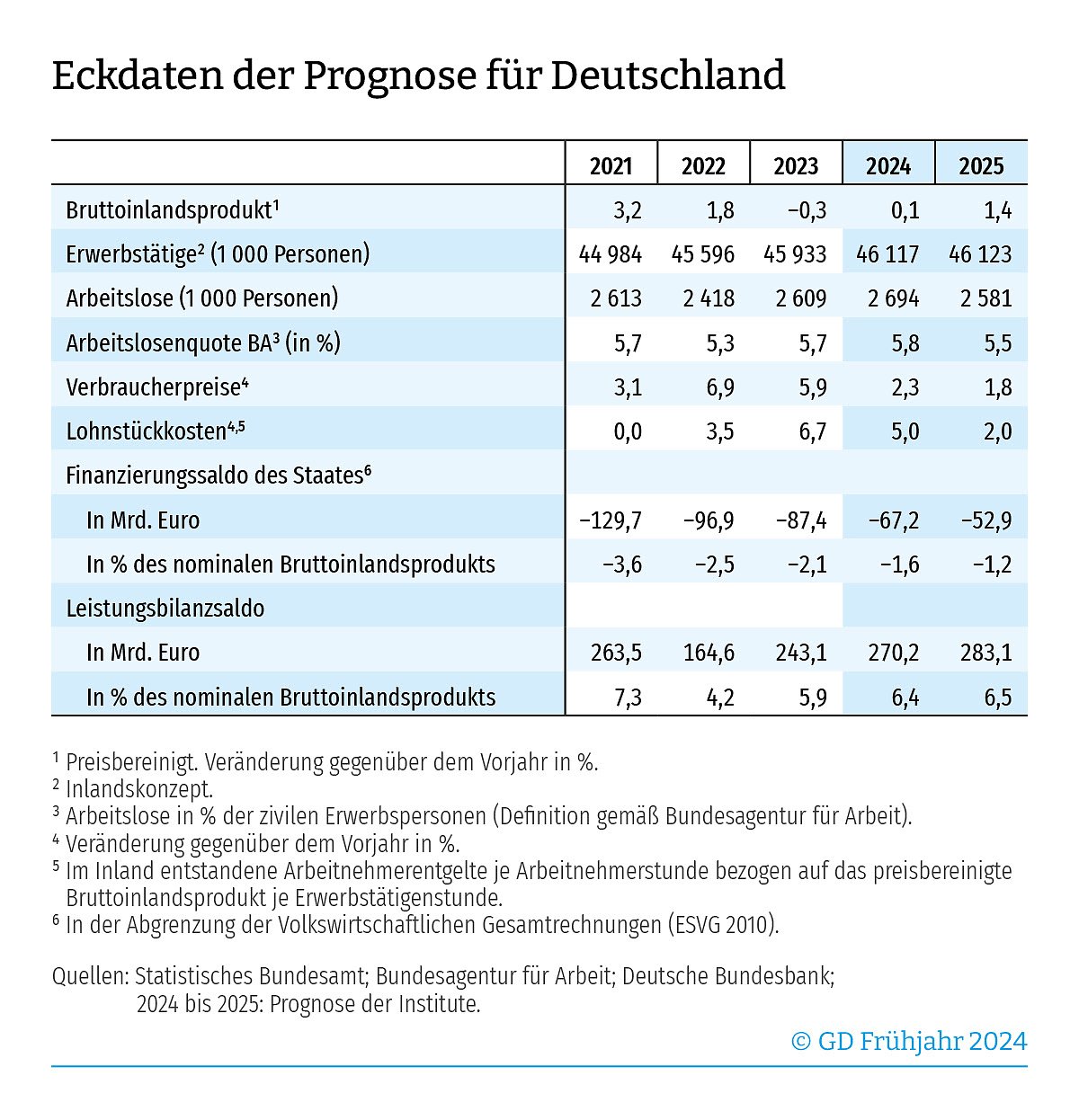 Im Herbstgutachten standen noch 1,3 Prozent in Aussicht. Für das kommende Jahr belassen sie die Prognose mit plus 1,4 Prozent nahezu unverändert (bislang 1,5 Prozent). Die Wirtschaftsleistung fällt dann aber infolge der verzögerten Erholung um über 30 Milliarden Euro niedriger aus.