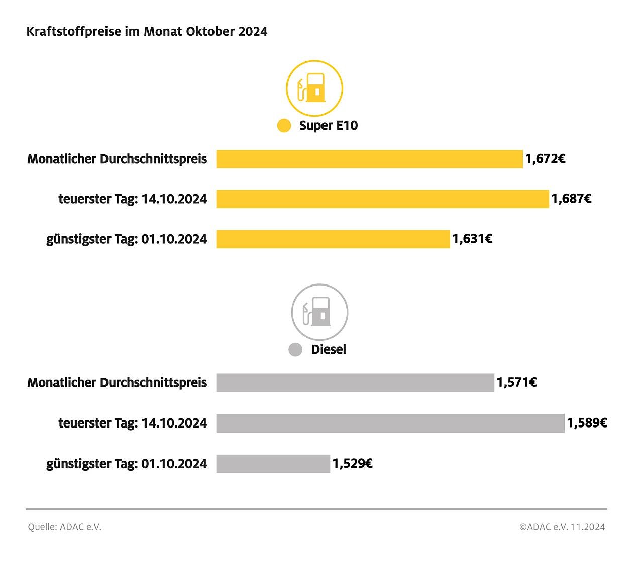 Der Oktober startete mit den niedrigsten Spritpreisen des Monats. Ein Liter Super E10 kostete am 1. Oktober, dem zugleich günstigsten Tag des gesamten Jahres 2024, 1,631 Euro und verteuerte sich bis zum 14. Oktober, dem teuersten Tag des Monats, um 5,6 Cent auf 1,687 Euro. Beide Tage markierten auch für Diesel das jeweilige Monatsminimum bzw. -maximum: So kostete ein Liter Diesel am 1. Oktober 1,529 Euro und kletterte bis zum 14. Oktober um sechs Cent auf 1,589 Euro.