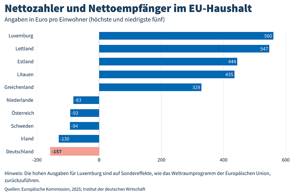 Mit 560 Euro pro Kopf fließt die höchste Summe aus dem EU-Haushalt nach Luxemburg. Das ist auf Sondereffekte wie das Weltraumprogramm der Europäischen Union zurückzuführen. Es folgen die drei baltischen Staaten Lettland (547 Euro), Estland (444 Euro) und Litauen (435 Euro). Mit insgesamt etwa 3,5 Milliarden Euro erhielt Griechenland die höchste Summe, gefolgt von Polen mit 2,7 Milliarden Euro. Im Jahr 2023 lag Polen mit 8,1 Milliarden Euro noch deutlich auf dem ersten Platz.