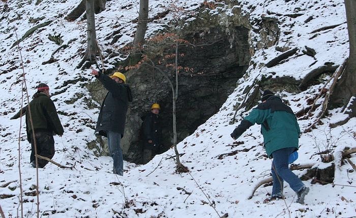 Autor: nnz/knDer Schnee knirscht unter den schweren Stiefeln. Sonst ist nichts zu hören. Die Luft ist klar und kalt. Nur ein paar dünne Wolkenstreifen durchkreuzen den blauen Himmel. Die Wintersonne steht tief, scheint durch die hohen Bäume hindurch. Hier und da raschelt unter der Schneedecke das verwelkte Laub. Meist verbirgt sich jedoch eine dicke glatte Eisschicht darunter. Der Hang hinauf zum ersten Eingang ist relativ steil.