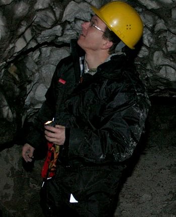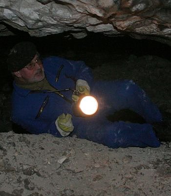 Der Eingang zu dem alten Stollen ist eng, das silberne Stahlgitter ist schon geöffnet. Wolfgang Sauerbier (Foto) setzt sich auf den Waldboden, hält sich an der Gitteraufhängung fest und schwingt sich durch die Öffnung. Schnell schaltet er seine Grubenleuchte an und beginnt, in die zahllosen Spalten und Öffnungen des Gipskarsts zu leuchten. Higgins, der Hund seines Freundes Lothar Hörning, fiept, läuft aufgeregt auf den aufgeschütteten Steinen herum und schnuppert in jeder Ecke.