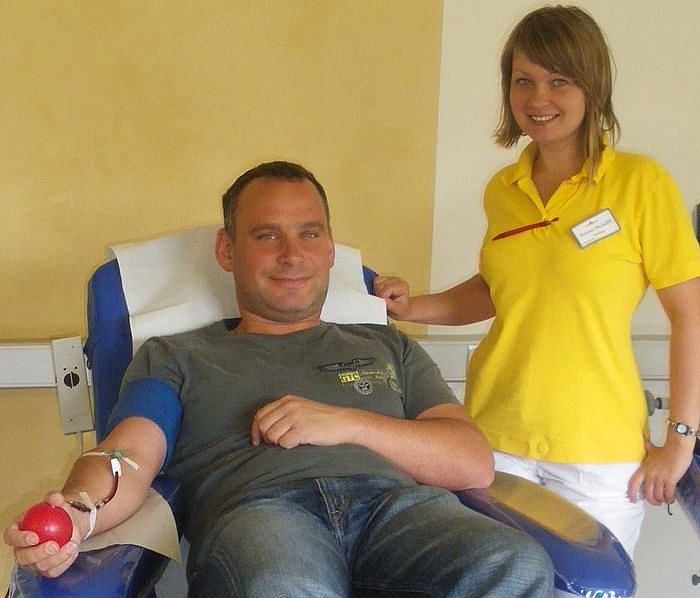 Autor: nnz/knFrank Janiszewski bei der Plasmaspende. Er wird von der Arzthelferin Melanie Michallik betreut