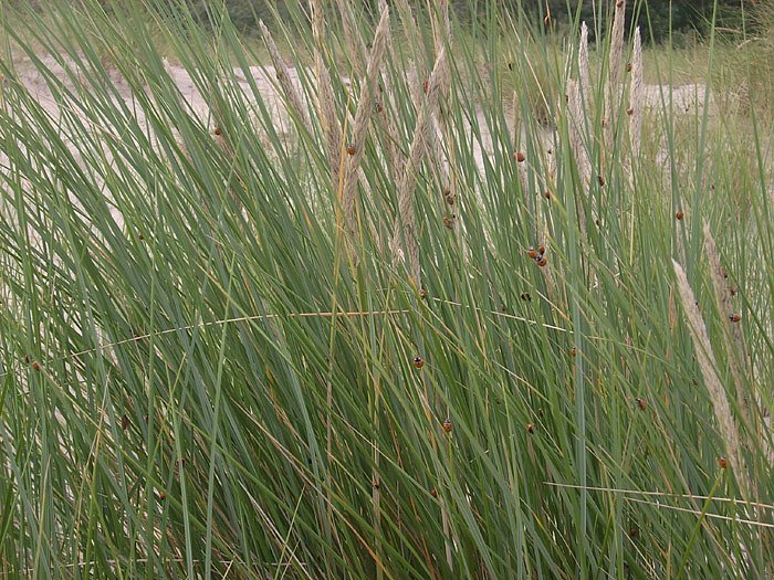 An den Granitfelsen der Hafenmole von Warnemünde waren die Marienkäfer (Bild oben) genauso zu finden, wie in den Dünen Höhe Diedrichshagen (Bild unten). Aber die sonst so harmlosen Marienkäfer saßen nicht nur auf den Steinen und den Pflanzen herum, sondern nutzen auch die Menschen als Parkplatz. Und nicht nur das!. Die Marienkäfer waren dabei so aggressiv, dass sie sich regelrecht versuchten, in der Haut zu verbeißen. An so eine Massenansammlung konnten sich selbst die Einheimische in den letzen 10 Jahren nicht mehr erinnern. Was besonders die Marienkäfer so aggressiv gemacht hat, kann man nur vermuten. Eine These könnte sein, dass für die riesige Anzahl an Tieren einfach nicht genügend Blattläuse als Nahrung zur Verfügung standen, und man eben versuchte die Menschen zu melken.