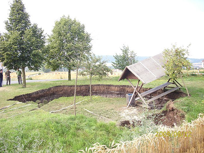 Autor: khhDer Erdrutsch ist ca. 10 Meter im Durchmesser , ca. 1-1,5 m tief und hat sich wie eine Scholle gleichmäßig gesenkt ohne zu zerbrechen. In der Mitte steht sogar noch ein Apfelbaum. Die Äpfel sind nicht einmal heruntergefallen.