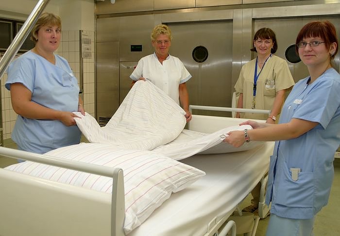 Die Logistik der Betten beschreibt Mitarbeiterin Angelika Ahrendt so: Wenn ein Patient unser Haus verlässt, dann informiert die jeweilige Station die Bettenzentrale, das Bett wird komplett abgeholt, zuvor abgedeckt. In der Bettenaufbereitung wird abgezogen, dann geht die Wäsche in die benachbarte Wäscherei. Das Bettengestell wird – je nach Durchlauf – per Hand oder in einer Waschanlage maschinell gereinigt. Dazu wird ein Strichcode gescannt, mit dem wiederum die Anzahl der erfolgten Durchläufe abgespeichert wird. Die Matratzen werden bei 75 Grad Celsius desinfiziert. Danach können die Betten von den unterschiedlichen Stationen wieder angefordert werden.