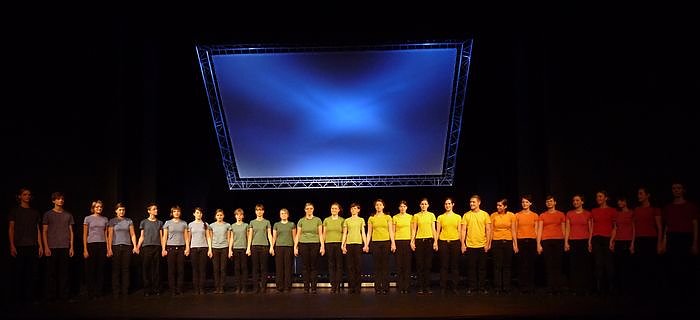 27 Jugendclubmitglieder im Alter von 13 bis 20 gaben den Texten Raum und Zeit sowie im wahrsten Sinne eine Bühne (Ausstattung: Wolfgang kurima Rauschning und Anja Schulz), auf der die Ansicht des Einzelnen aus der Masse heraustritt, das Individuum aber in der Gemeinschaft wieder aufgehoben wird. Was Worte nicht fassen können, wird in Gesang ausgedrückt.