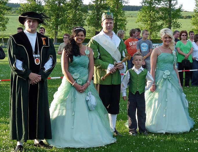 Natürlich wurde das Aufstellen des Besen von viel Prominenz beobachtet. Sogar Hoheiten waren dabei, so der Laubkönig Mario I. mit seinen bezaubernden Hofdamen Jenny I und Tina II. Und sogar ein Bürgermeister aus Bad Frankenhausen, Matthias Strejc, war dabei, der aus einer anderen Zeit entsprungen sein muss, sieht man seine kostbaren Gewänder an. Ein heutiger Bürgermeister könnte sich das nicht leisten, oder? Und sogar einen richtigen Zermonienmeister (Uwe Burghardt) leitete das Ganze.