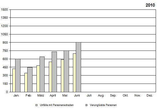 Im ersten Halbjahr 2010 verunglückten 290 Kinder. Das waren 38 Kinder weniger als im ersten Halbjahr 2009. Dagegen ist die Anzahl der verunglückten Senioren ab dem 65. Lebensjahr von 444 auf 460 Personen gestiegen.