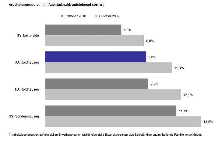 Die Arbeitslosenquote, bezogen auf alle zivilen Erwerbspersonen, ist von 9,4 auf 9,0 Prozent gesunken und hat damit das Niveau der Region Erfurt erreicht. Während sich die Quote im Kyffhäuserkreis nicht verändert hat, sank im Landkreis Eichsfeld die Quote um 0,3 Prozentpunkte auf 6,8 Prozent und im Landkreis Nordhausen von 10,2 auf 9,2 Prozent.