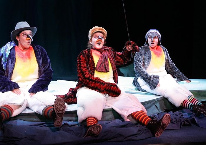 In einem Bühnenbild von Wilfried Buchholz sind als Pinguine Laura Göttner, Miriam Gronau und Ulrike Knobloch bzw. Charlotte Ronas zu sehen, die Taube wird gespielt von Rayk Gaida. Das Stück „An der Arche um acht“ wurde mehrfach ausgezeichnet, u. a. mit dem Deutschen Kindertheaterpreis 2006.