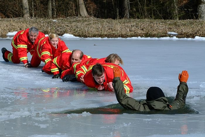 Helfer sollten bei der Rettung einen Sicherheitsabstand zur Einbruchstelle einhalten und sich gegenseitig auf dem Bauch liegend durch eine Rettungskette sichern. Nach der Rettung aus dem Eis sollte der Patient in einem beheizten Raum langsam aufgewärmt werden und sich grundsätzlich in ärztliche Behandlung begeben.