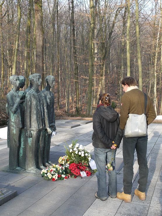 Da man die Gedenkstätte Mittelbau Dora als Veranstaltungsort gewählt hatte, lag es nahe die Betrachtungen über die Gegenwart mit einem Blick auf die Vergangenheit zu verknüpfen. Bevor aber ein Großteil der anwesenden an einer Führung durch das ehemalige Konzentrationslager, die Stollen und die Dauerausstellung teilnahmen, hatte Gisela Hartmann von den Nordhäuser Grünen noch ein dringendes anliegen. Im Gedenken an Dorothea August, die Vorsitzende des Vereins Jugend für Dora, die vor knapp zwei Wochen einer kurzen aber heftigen Erkrankung erlag, legte man einen Blumenkranz am Mahnmal vor dem ehemaligen Krematorium nieder, um die Arbeit und das Engagement von Frau August zu würdigen.