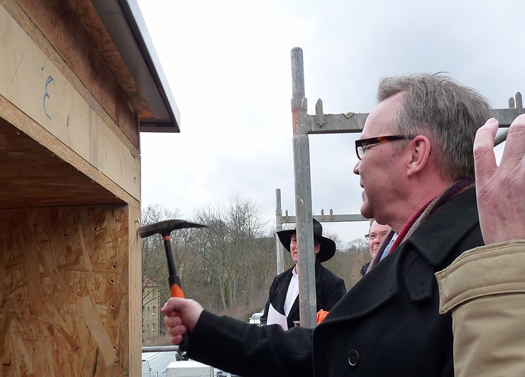 Der Baufortschritt und die Schwierigkeit einen geeigneten Termin zu finden bewirkte, dass auf dem Neubau des Gästehauses der Landesmusikakademie bereits das Dach drauf ist. Damit stand man natürlich vor dem Problem, dass man nun keine Richtkrone mehr setzen konnte. Also musst eine andere geeignete Form gefunden werden. Man einigte sich, an geeigneter Stelle symbolisch einen Nagel einzuschlagen, damit auch der Richtspruch gehalten werden kann.