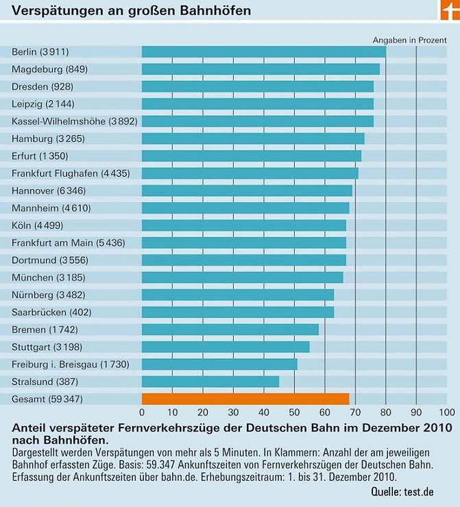 Als pünktlichster Bahnhof im Test erwies sich Stralsund im Nordosten. Ein Grund: In die Hansestadt fahren keine verspätungsanfälligen ICE-Züge. Auch in Freiburg im Breisgau erreichten Reisende häufig rechtzeitig ihr Ziel. Hier zahlten sich die Qualitätsvorgaben der Schweizer aus. Züge aus der Schweiz kamen öfter pünktlich an als die aus dem Norden. Deutlich mehr Geduld mussten Reisende an den großen Hauptbahnhöfen von Berlin, Leipzig und Dresden aufbringen. Von vier Fernzügen erreichte hier höchstens einer halbwegs pünktlich sein Ziel.Netz braucht Sanierung