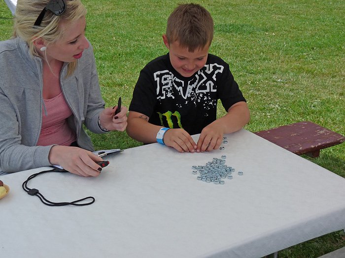 Es galt wirklich in einer vorgegebenen Zeit (60 Sekunden) auf einem nicht gerade standsicheren Tisch Muttern zu stapeln. Nach abgelaufener Zeit wurde gezählt, wie viele Muttern gestapelt wurden. Der Rekordhalter (Justus Weißenborn - nicht im Bild) brachte es auf immerhin auf 38 Muttern! Leider war hier nnz/kn nicht zur Stelle um den Turm zu fotografieren.