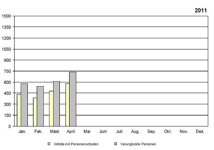 Bei diesen Unfällen kamen 41 Verkehrsteilnehmer ums Leben, 10 Menschen mehr als von Januar bis April 2010. Auch die Zahl der Verletzten stieg um 33 auf 2 424.