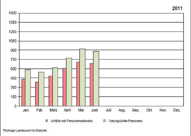 Beim Hauptverkehrsmittel, dem Pkw gab es in den ersten sechs Monaten dieses Jahres 40 Todesop-fern zu beklagen. Im vergleichbaren Zeitraum des Vorjahres waren es 42 Pkw-Fahrer und Mitfahrer. Im Straßenverkehr auf Thüringer Straßen spielte bei 2,0 Prozent aller Unfälle Alkohol eine Rolle. Insgesamt 522 Unfälle ereigneten sich in den ersten sechs Monaten des Jahres 2011, wobei jeweils mindestens ein Beteiligter unter Alkoholeinfluss stand. Die Anzahl dieser Unfälle ist im 1.Halbjahr 2011 um 9,4 Prozent zurückgegangen. Durch Alkohol am Steuer verloren 3 Menschen ihr Leben. Im 1. Halbjahr 2010 gab es dagegen 6 getötete Personen.